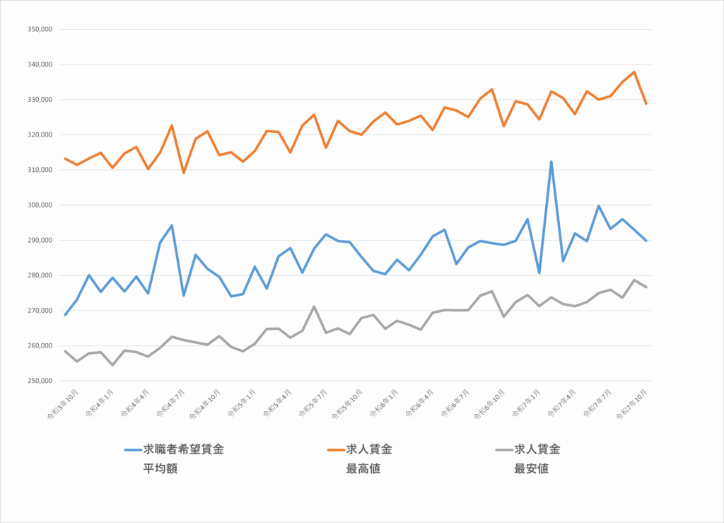 とはいえ、依然として290,000円前後の高水準をキープしており、「年明けから給与条件を見直したい」という求職者の期待は根強くあることが読み取れます。